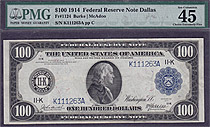 This is a nice 1914 $100 Dallas FRN with the serial # of K111263A. Ben Franklin graces the front.It is graded as a PMG EF-45EPQ. This is one of the fe...