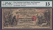 Fr.-1136 1865 $5 Ch. 1741 First Nat. Gold Bank, San Franciso, CA Ser. K276456 PMG F-15