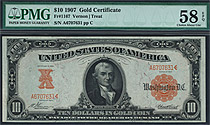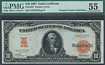 This is the 1907 $10 Gold Certificates which features the Vernon and Treat signature combination. It is in a PMG-55 holder and is from the famous Newp...