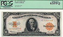 Fr.-1173 1922 $10 Gold Certificate Ser. H87630608 PCGS 63PPQ