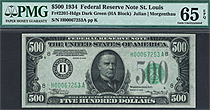 This is a beautiful example of a PMG-65EPQ GEM 1934A $500 bill with the serial number of B00335033A. The 1934A series is much scarcer than the 1934 pl...