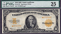 How about a 1922 $10 Gold Certificate Star note. This is a very clean circulated example with no problems at all. There are no rips, tears, pinholes o...