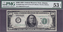 This is a very nice 1928 Atlanta $500 FRN with the serial number of F00018197A and is in a PMG-AU 53EPQ holder. Atlanta is a very hard district for an...