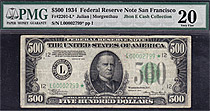 This 1934 $500 FRN Star is from the San Francisco district. This is only one of 14 known. The serial number is L00003515*. It has been graded as a PMG...