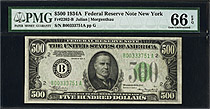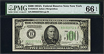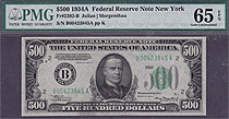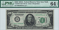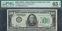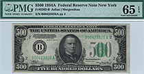 This is a very nice 1934A New York $500 FRN. The serial number is B00354303A and resides in a PMG GEM-65EPQ holder. 1934A $500 bills are more scarce t...