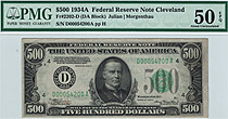 This is a very nice 1934A $500 FRN from the popular and tough Cleveland District. The serial number is D00054200A and is in a PMG-50EPQ holder. It is ...