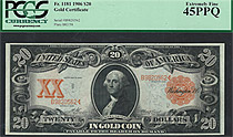 Here is a nice problem free and totally original mid grade 1906 $20 Gold Certificate in a PCGS-45E{PQ holder. the serial number is B9820562. It is har...
