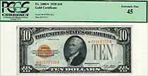 Here you have the perfect 1928 $10 Gold Certificate in a GEM PMG-65EPQ holder. The serial number is A80435128A. When you come across a note like this ...