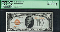POP4/3 This is a stunning Superb GEM 1928 $10 Gold Certificate in an incredible PCGS-67PPQ holder. The two golden serial numbers are A57058821A.