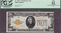 Fr.-2402* 1928 $20 Gold Certificate Star Note Ser. 00365383A PCGS 62