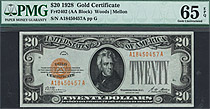 Here is another nice GEM uncirculated 1928 $20 Gold Certificate in a PCGS-65PPQ holder. The serial number is A4142263A. You can see it is one of the n...