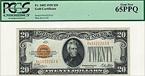 This is a great GEM-65 example of the ever popular 1928 $20 Gold Certificate. The serial number is A41422263A and it resides in a PCGS-65PPQ holder. ...