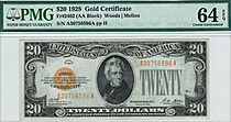 Fr.-2402 Here we have an almost GEM 1928 $20 Gold Certificate in a PMG-64EPQ holder. The serial number is A30756596A. The front and back faces up beau...