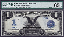 This is a super 2-digit 1899 $1 Black Eagle Silver Certificate. The serial number is H70A and it is in a PMG-65EPQ holder. You can definitely see the ...