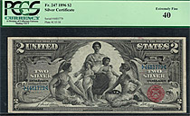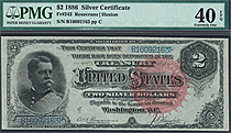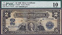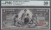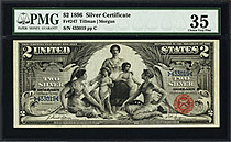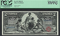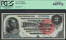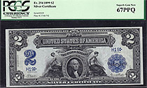 Another top notch note is listed here as a $2 1899 Silver Certificate. it is graded as a GEM PMG-65EPQ. The serial number is 10490585. It features bri...
