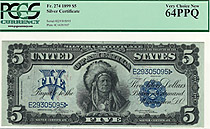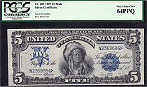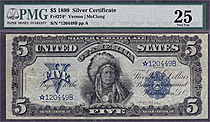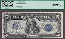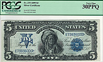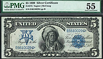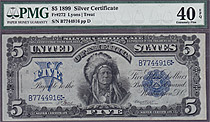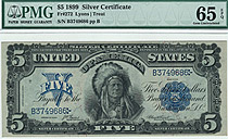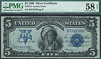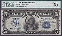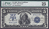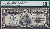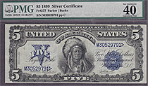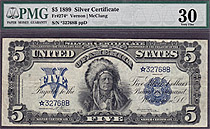 This 1899 $5 Silver Certificate is also known as the Chief Note for obvious reasons. It features the head of Chief Ta-to-ka-in-yan-ka, also known as R...