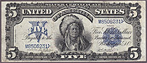 This is the famous 1899 $5 Silver Certificate commonly referred to as the Chief Note. It features the head of Chief Ta-to-ka-in-yan-ka, also known as ...
