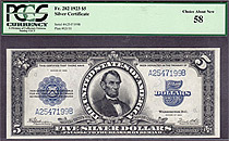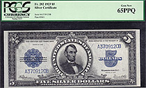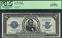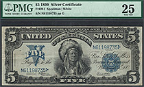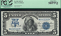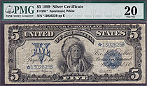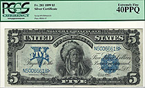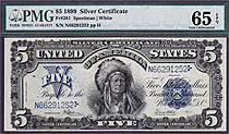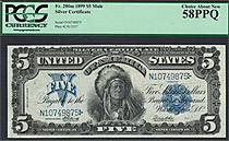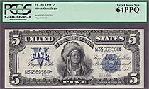 How about a near GEM-65 1899 $5 CHIEF Silver certificate. The serial number is N34569560 and is in a Choice Uncirculated PCGS-64PPQ holder. A un-notic...