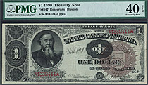 This is the famous 1890 $1 Treasury note with the popular large brown spiked seal. The serial number is A1332444 and it resides in a PMG XF-40EPQ hold...