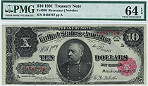 This is a very nice Fr-369 or 1891 $10 Treasury note. The serial number is B434757 and is in a PMG-64EPQ holder. This is sometimes refereed to as the ...