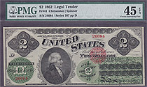 This is a real nice 1862 $2 Legal Tender in a PMG-45EPQ holder. The serial number is 26084 and it is totally original never doctored or cleaned or pre...