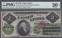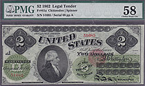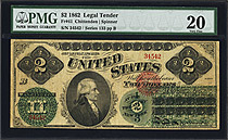 Here is a real super deal on a 1862 $2 Legal Tender or sometimes refered to as a FR.-41a. The serial number is 51685 and is in a PMG-58 holder. The le...