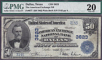 This is a 1902 Plain back NBN from the American Exchange National Bank of Dallas, TX. It has the serial number of 3145 and is housed in a PMG VF-20 ho...