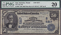 Here is a nice 1902 $50 Plain Back from The City National Bank of San Antonio, Texas. The Charter # is 5217 and the bank serial number is 5387. It is ...