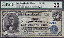 Here is a nice 1902 $50 Plain Back from the First National Bank in East St Louis in Illnois. The charter number is 11596 and the serial number is 5095...