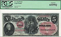 This is an outstanding example of the earlier 1878 $5 Legal Tender or commonly refered to as the Woodchopper or Pioneer note. The serail number is A57...