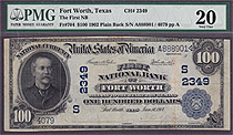 Here we have one of my favorite notes. It is a 1902 $100 Plain Back from th First National Bank of Ft Worth, Texas. The serial # is 4079 and the chart...