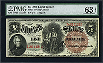 This 1880 $5 Legal Tender with the ever popular Large Brown Spiked Seal features fully origional embossing. Nearly all of the printed details can be e...