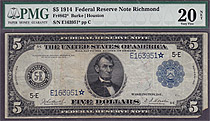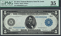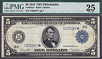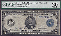 Here is a 1914 $5 FRN star from the Cleveland district. It has been graded as a PMG-VF-20. The serial number is D470245*. Only 25 known....