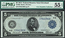 Fr.-856 1914 $5 Cleveland (Blue Seal) FRN Ser. D7641360A PMG-55EPQ