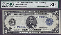 Fr.-881J 1914 $5 FRN (Inverted face error) Ser. # J13544293A PMG VF-30