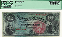 This Fr.-96 or 1869 $10 Legal Tender is commonly refered to as the Jackass Note, so called because the eagle on the bottom of the note looks like the ...