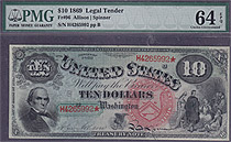 This is one stunning 1869 $10 Legal Tender Rainbow notes. This note is in a PMG-64EPQ holder. The serial number is H4265992. The 1869 Rainbow Legal Te...