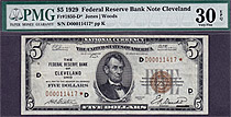 A cool 1929 $5 Cleveland FRBN Star. This EX-Dean Oakes and Jhon E Cash pedigreed note has the serial # of D00011417*. It is graded as a PMG VF-30EPQ. ...
