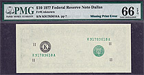 This error note has no date on it. The complete 2nd print is missing on this superb GEM error note. This Dallas $10 FRN is in a PMG-66EPQ holder. Seco...