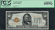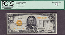 How about a real nice 1928 $50 Gold certificate with nice original colors and paper. The serial number is A0275784A and is in a PCGS-40PQ holder. Gett...