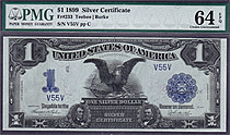 This is a 1899 FR-233 $1 Black Eagle with a fancy serial number V55V in a PMG-64EPQ holder. An uncommon number in an uncommon FR#. For that person who...
