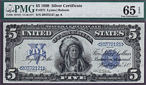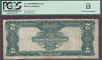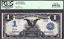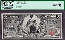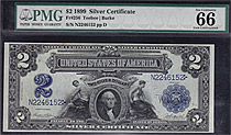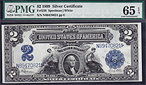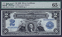 Another top notch note is listed here as a $2 1899 Silver Certificate. it is graded as a GEM PMG-65EPQ. The serial number is 10490585. It features bri...