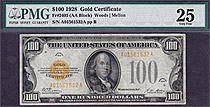 This is a real nice 100% original 1928 $100 Gold Certificate that has been graded as a PMG VF-25. The serial number is A01561532A. PMG does not give E...