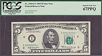 Here is a really cool 1969 $1 Federal reserve $5 note form the ever tough Minneapolis district. The serial numberis I00000056*. It is in a PMG-66EPQ h...