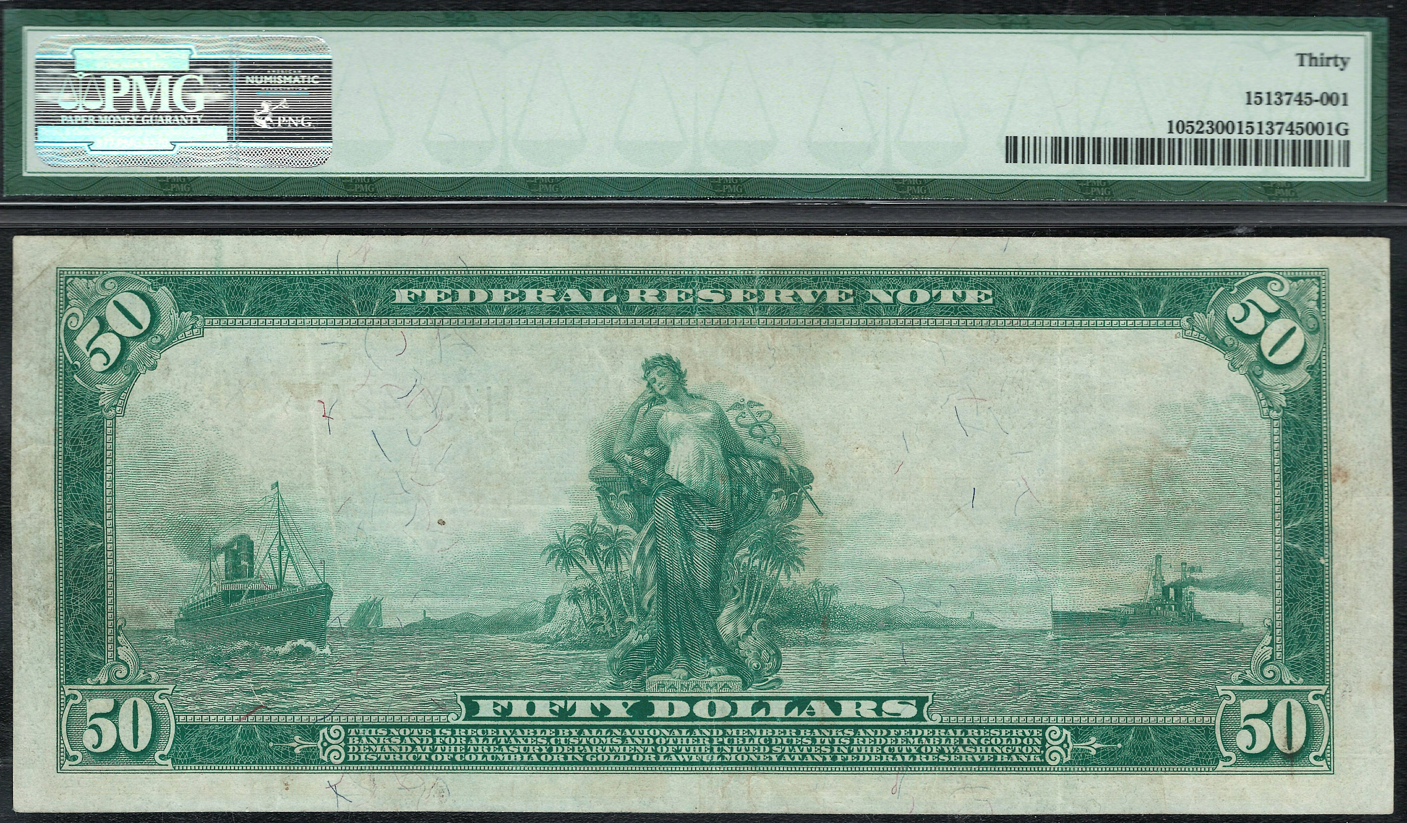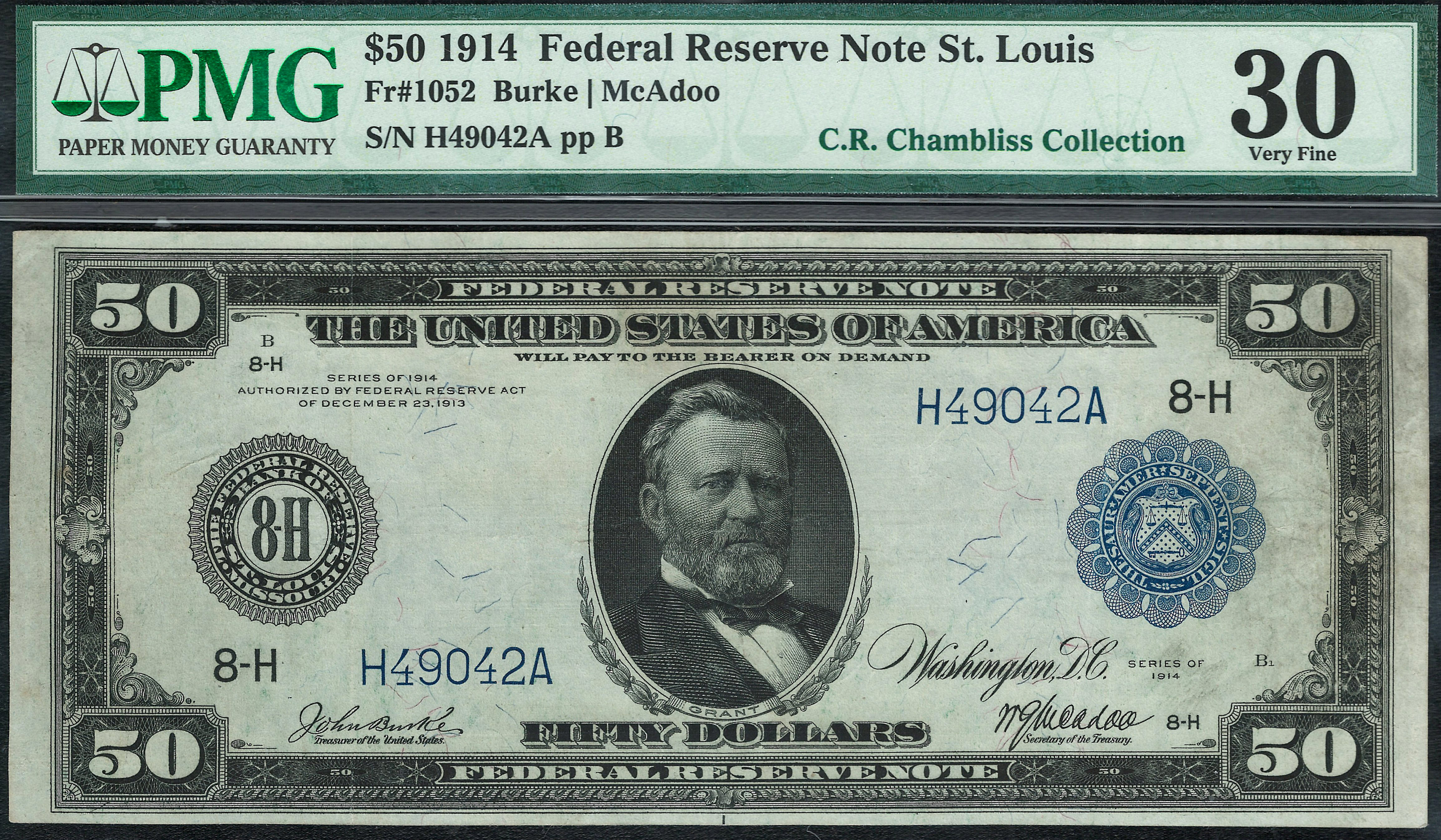 Fr.-1052H 1914 $50 St. Louis (Blue Seal) FRN Ser. H49042A PMG-30