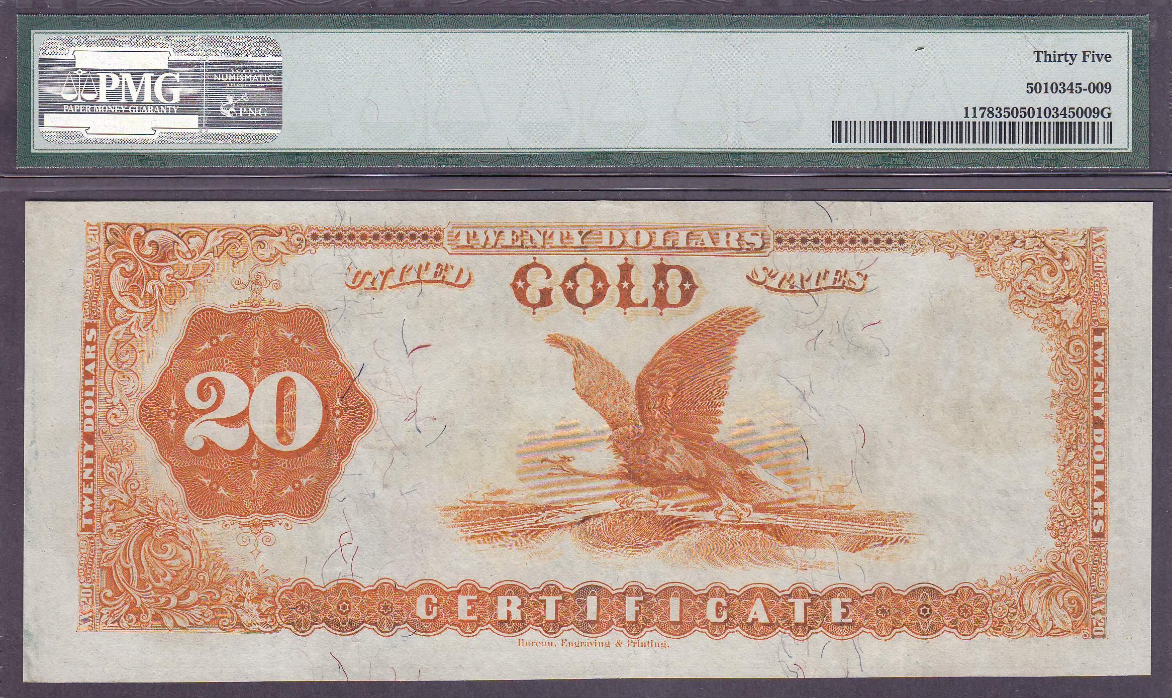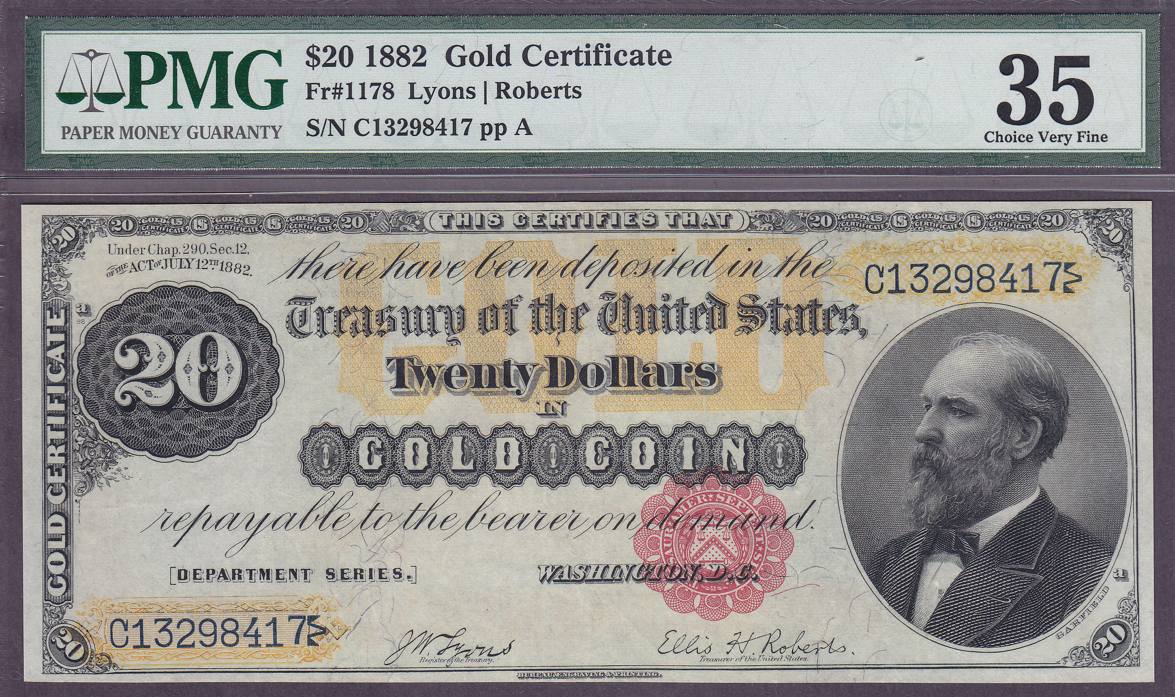 This is a very nice 1882 $20 Gold Certificate, All of the 1882 $20 and especially the $50 dollar gold certificates are very difficult to find without any repairs. I have been looking for one with a EPQ or PPQ notation, but they have not been around for the last several auctions or shows. I liked this note because it was problem free with real dark and vibrant gold colors on the reverse. Most of the gold certificate are faded due to past cleanings and natural fading. I also purchased a 1882 $20 gold certificate in a PCGS-50 holder which may still be on the website. If you are in the need of a nice 1882 $20 Gold Certificate that has some of the best coloring you can find, this is a must consideration. The serial number is C13298417 and is in a problem free PMG-35 holder.
