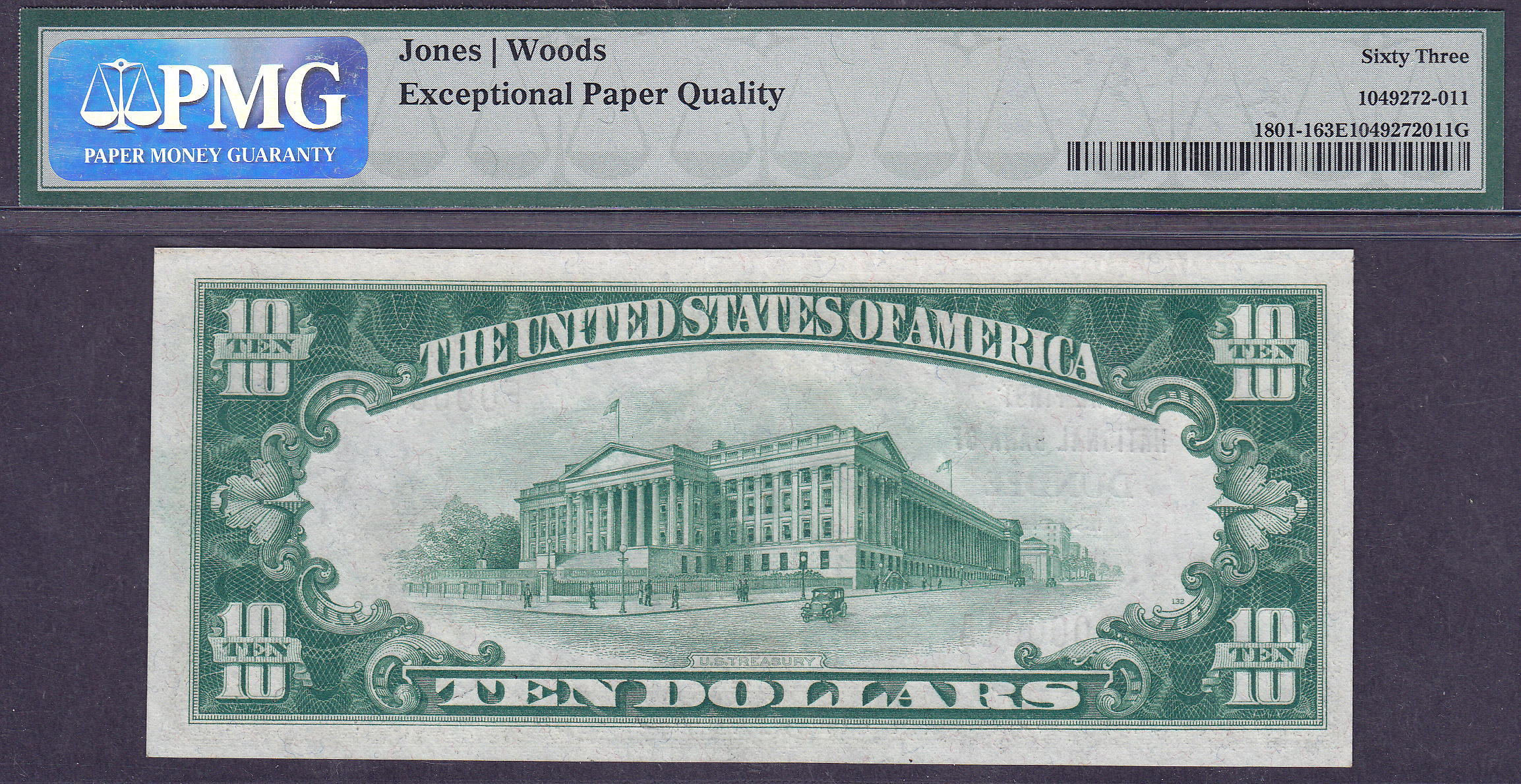 A nice example of a 1929 $10 NBN from the First National Bank of Dundee, Il. Almost a GEM, except for the margin on the left. A rare serial number 1 note that is highly sought after by Illinois collectors. Totally original. Serial # F000001A.