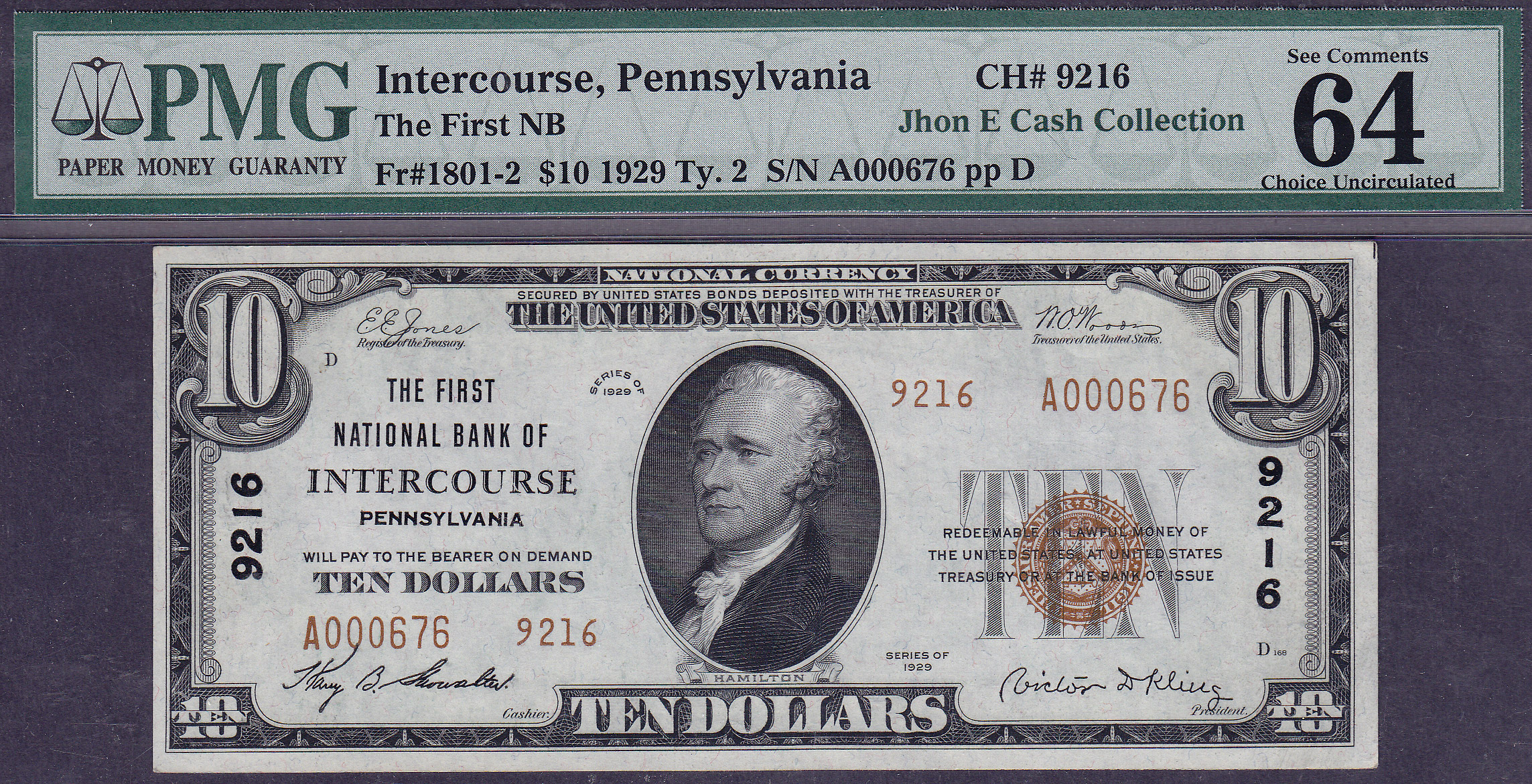 HOW COOL IS THIS NAME, The First National Bank of "INTERCOURSE", PA. THE SERIAL # IS A000676. THIS IS THE ONLY UNCIRCLUATE EXAMPLE I HAVE EVER BEEN ABLE TO LOCATE ON THIS FAMOUS BANK. IT IS ALSO A TYPE 2 NATIONAL BANK NOTE, WHICH IS MUCH RARER THAN THE TYPE-1. THE TYPE II NOTES HAVE 4 CHARTER NUMBERS ON THE FACE VS 2 FOR THE TYPE I.