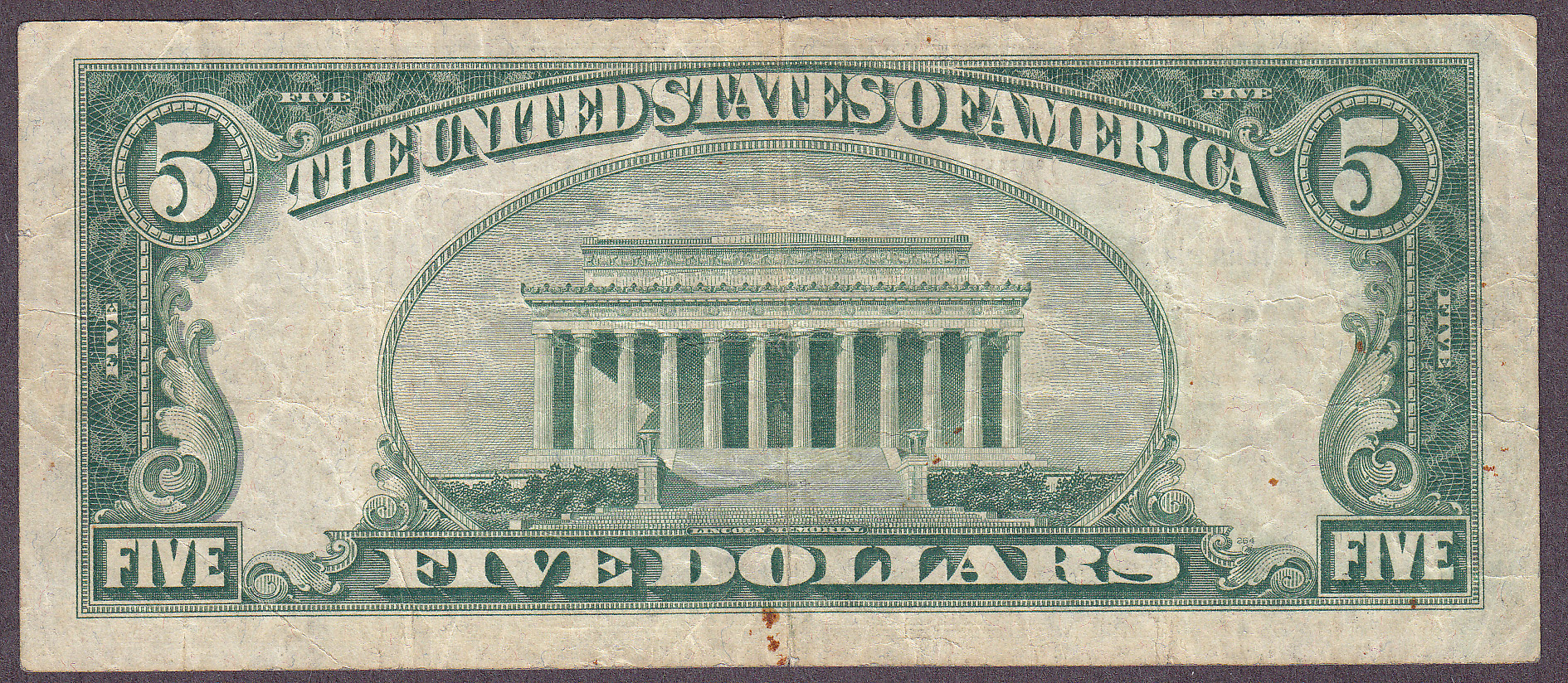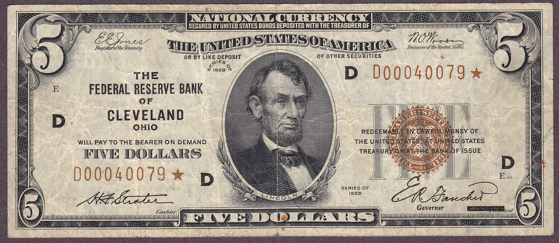 This is an circulated example of the 1929 $5 FRBN star from Cleveland. There were only 60,000 printed and there are 34 known. Most are in this VF grade. This note is actually in good shape for its grade. There are not rips, tears or pinholes. There is a speck of rust on the obverse. The serial number is D00040079*.