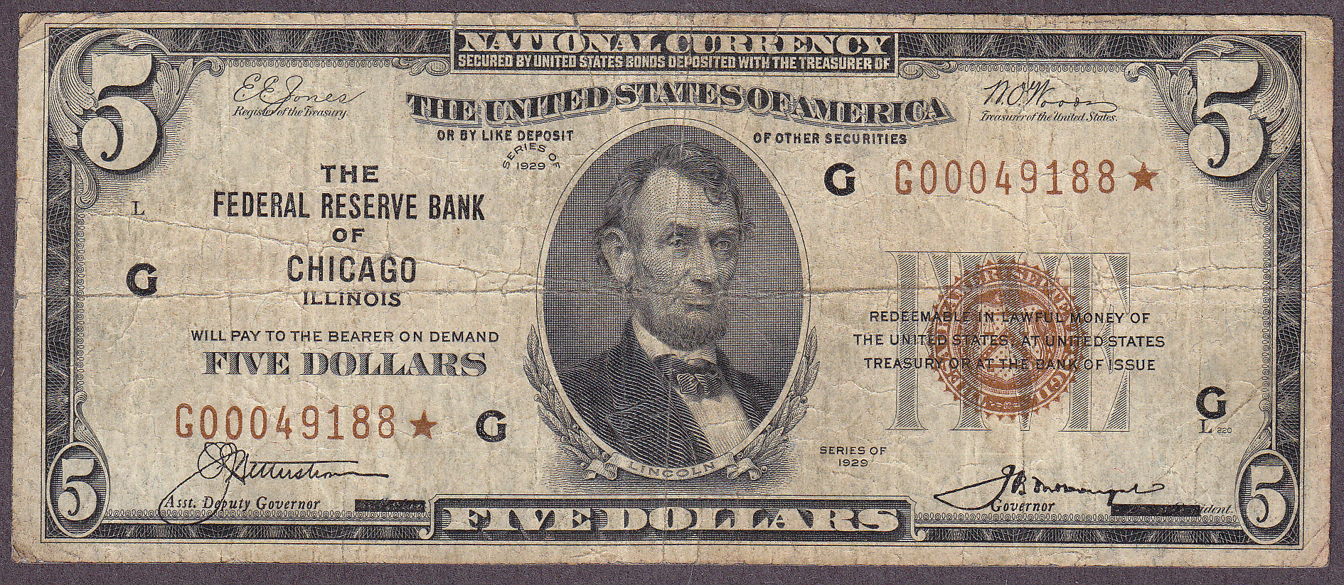 This is a nice circulated 1929 $5 FRBN star from Chicago. There are 57 known and this is one of them. A nice note for the price. The serial numvber is G00049188*.